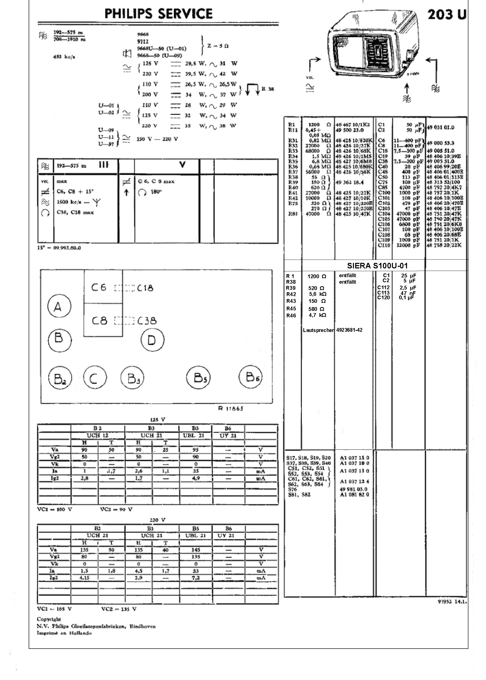 Die ursprüngliche Röhrenbestückung des 203U ist UCH21, UCH21, UBL21 und UY21. Später wird anstelle des Gleichrichters UY21 auch der UY1N (mit einem anderen Röhrenfuß, kein Allglas, aber elektrisch gleichwertig) verwendet. Das erklärt, daß bei dem 1943 herausgekommenen Modell Siera 100U ein Gleichrichter vom Typ UY21N anzutreffen ist. Auch unser Exemplar ist mit UY21N ausgestattet. Die Kontrolllampe ist ein kleines Neonlämpchen (Z10, Codenummer A1 358 18).