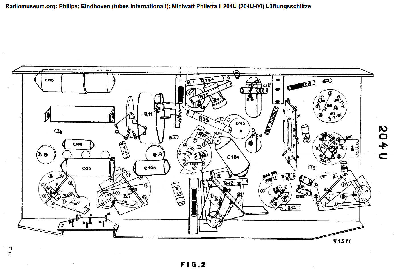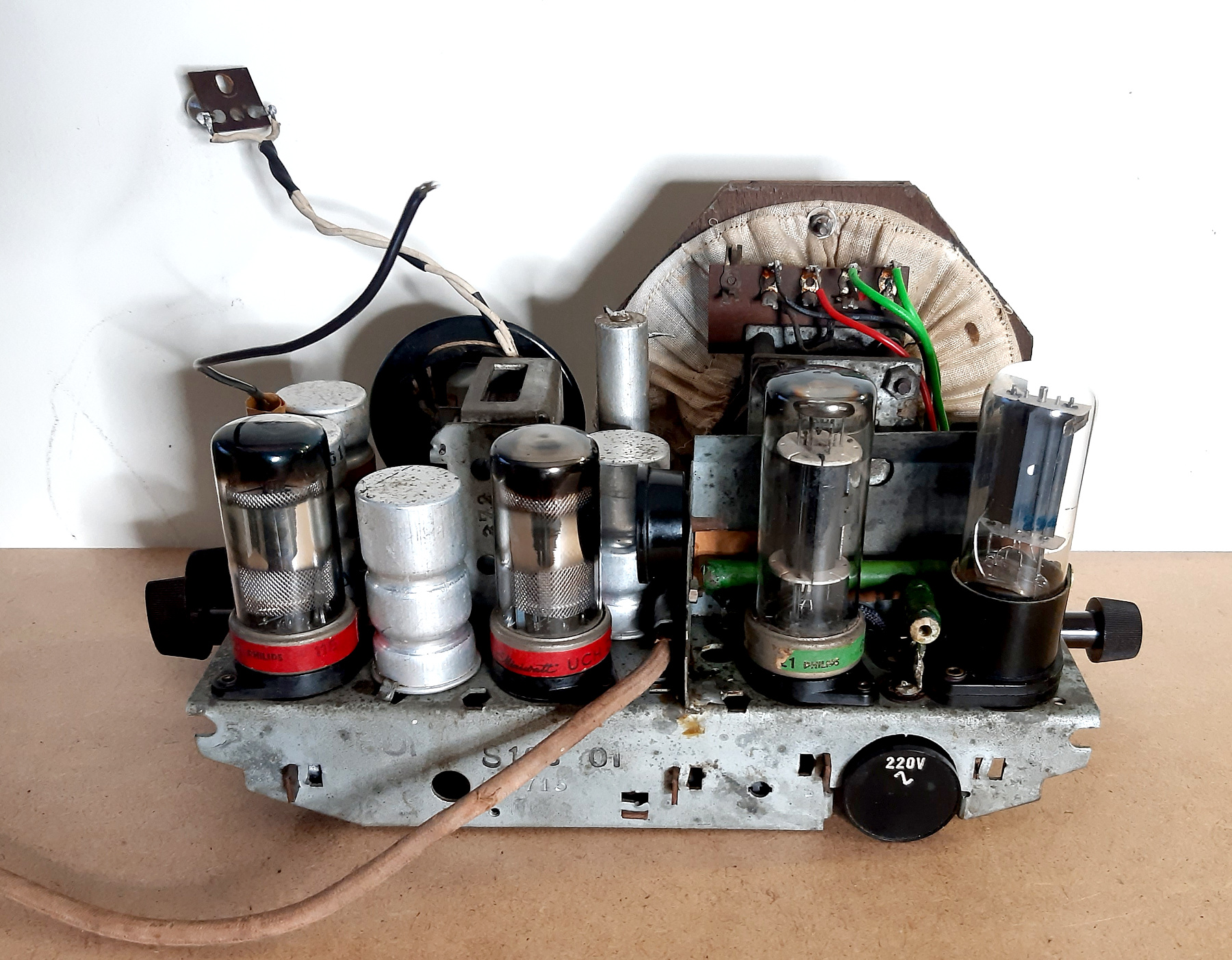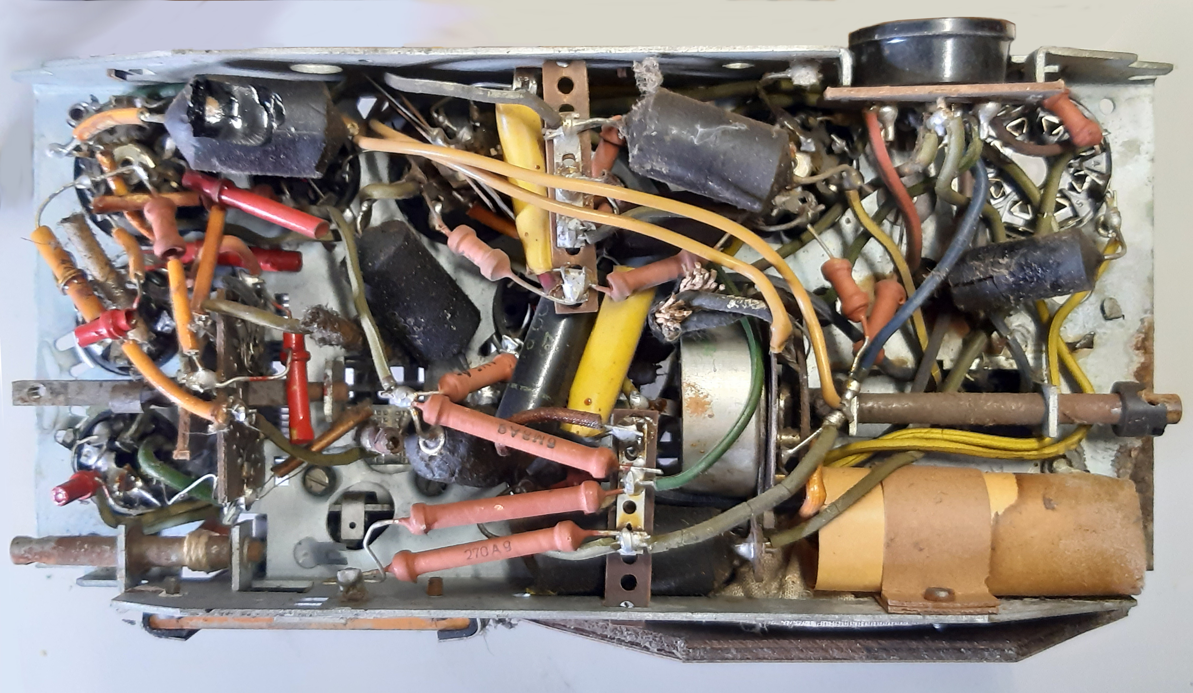 Für Philips typisch ist der fliegende Aufbau mit wenig Lötleiste, "3D-Verbindungen" werden oft auf kurzem Weg über Drahtwickel verlötet. Um an die tiefer liegenden Teile zu gelangen, empfiehlt sich das einseitige Ablöten störender Teile. Alle Kondensatoren im Teerverguß sind rissig, die 4 Elkos sind alle total vertrocknet. Lautsprecher, AT, Drehko sind intakt. Alle Widerstände sind innerhalb der Toleranz, auch die grün emaillierten Drahtwiderstände zeigen keine Anzeichen von Überlastung. Einige Materialmängel weisen auf Engpässe hin, so sind viele Bauteilisolierungen in beigem Papier ausgeführt. Der verwendete isolierte Schaltdraht ist ausgehärtet und verliert die Isolierung bei geringstem Verbiegen. Am gut erhaltenen Gehäuse ist die verschimmelte Bespannung (Papiergarngewebe) zu ersetzen und eine zerbrochene Chassisbefestigung aus Bakelit zusammenzukleben.