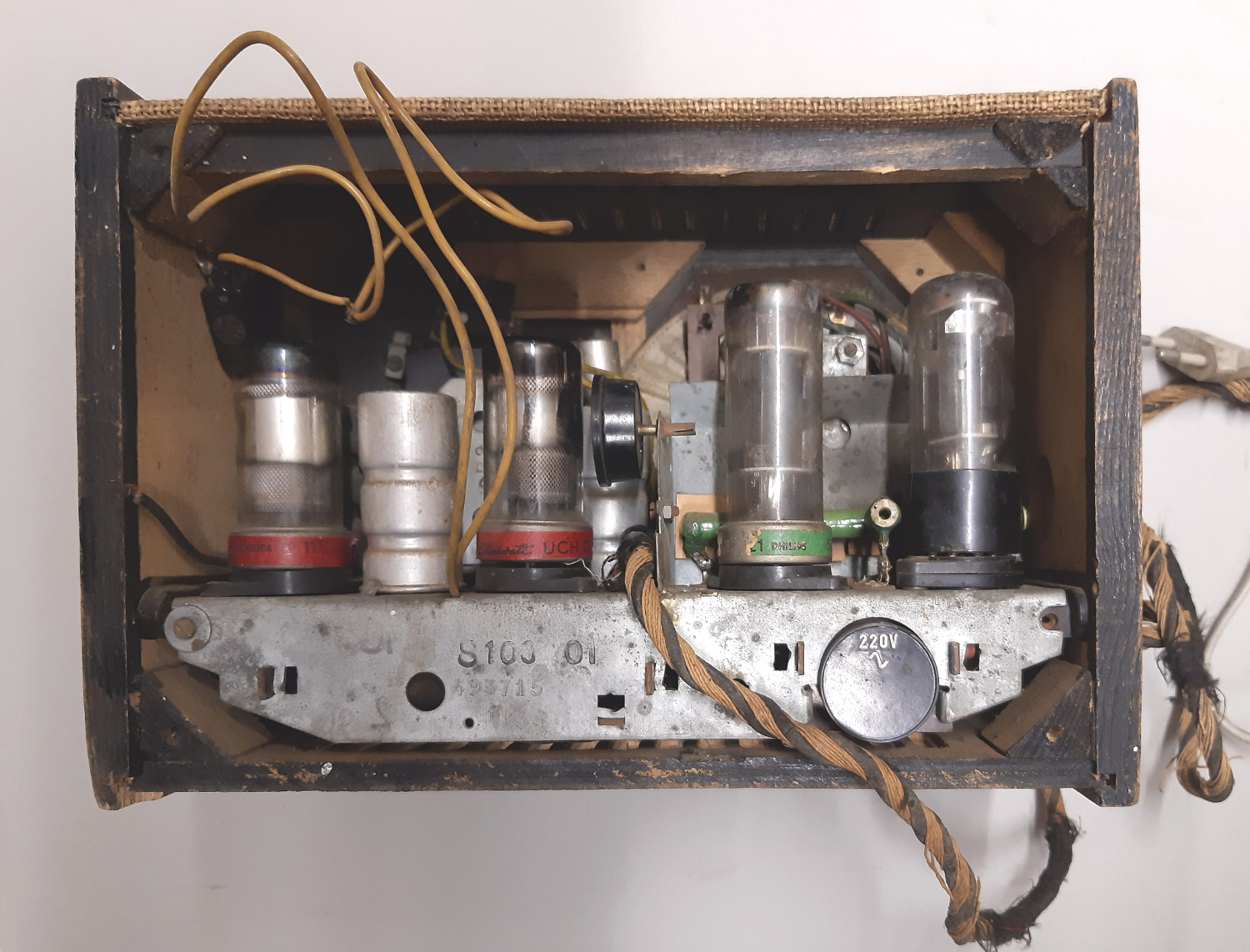 Der zweipolige Ein/Ausschalter wird über den Lautstärkesteller betätigt, der Schnappmechanismus ist in Ordnung, aber das Schiebestück zwischen den Kontakten fehlt bei unserem Gerät. Einer frühen Reparatur verdankt das Gerät eine extra Seitenbohrung zur Aufnahme eines Flachdrehschalters. Der in Auflösung begriffene Netzanschluß besteht aus einem zweiadrigen Kabel im braunen Gewebemantel. Die Rückwand fehlt. Die Gleichrichterröhre UY1N ist defekt (Glühfadenbruch).