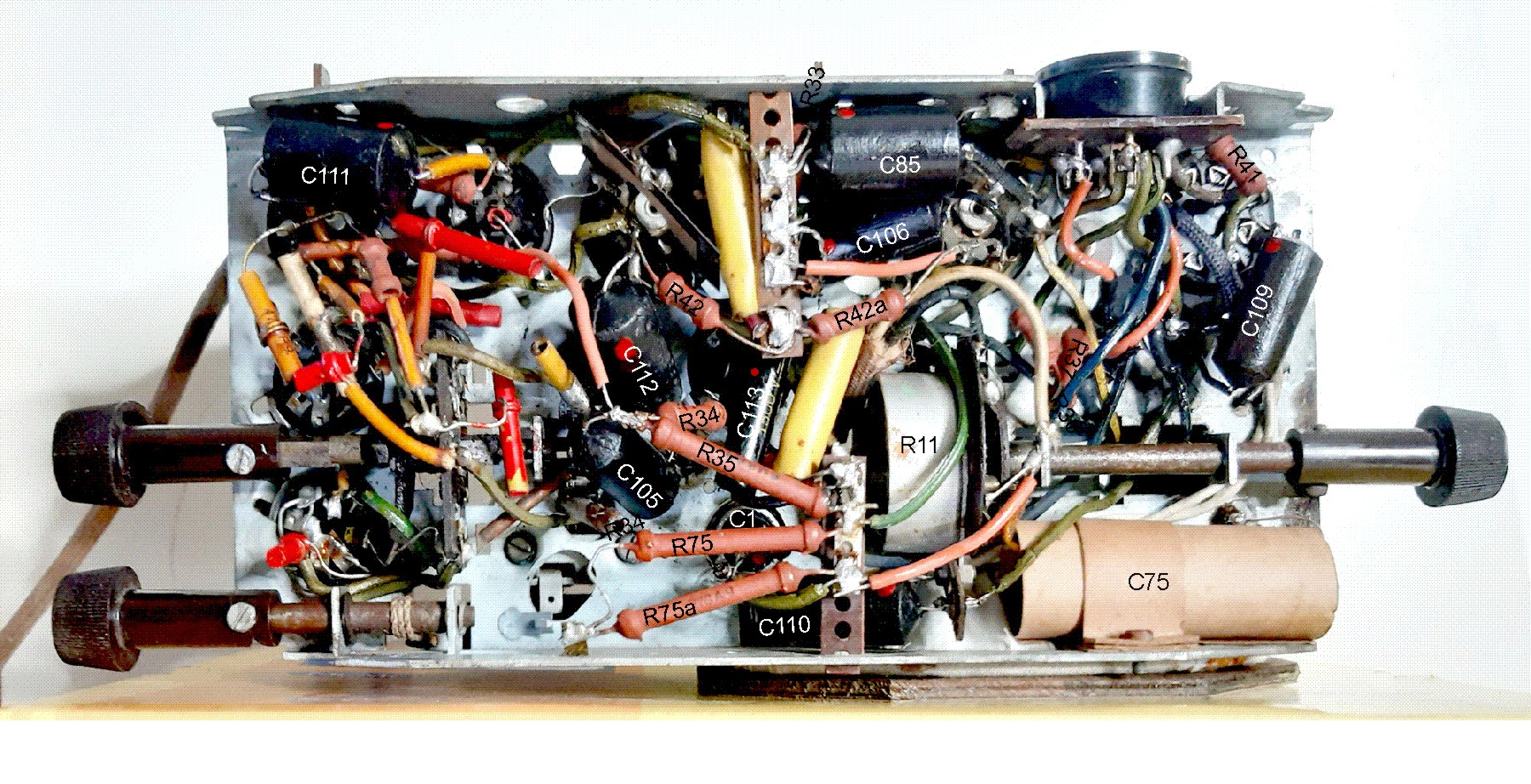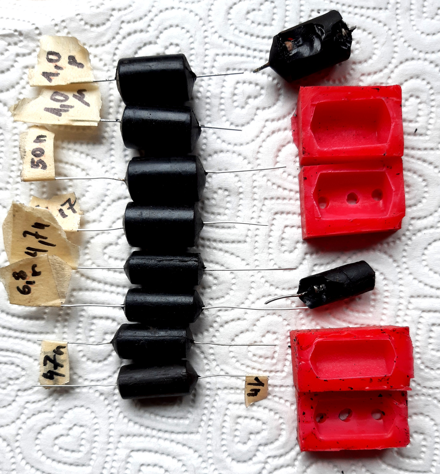 Die ausgetrockneten Elkos wurden ausgetauscht, wobei die seltene Form des C75 erhalten blieb. Die Papierisolierung ist wichtig, sie trennt den Minuspol vom Chassis. Beim C1 verhüllt der Papierwickel das Neuteil. Für die typischen schwarz geteerten Papierkondensatoren von Philips wurden Gußformen in zwei Größen erstellt, in die moderne Komponenten vergossen wurden.
