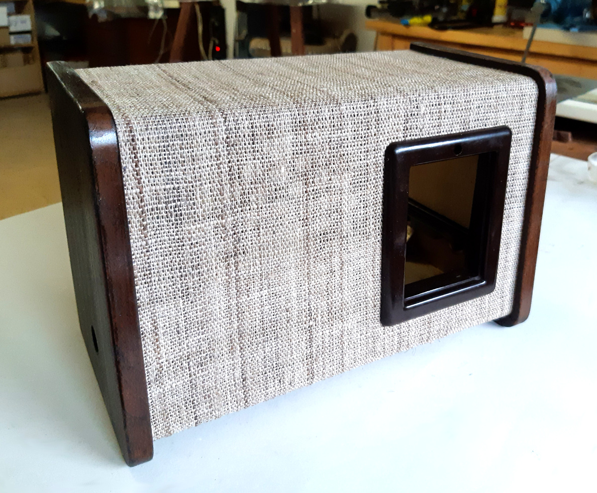 Das originale Papiergarngewebe wird kaum mehr erhältlich sein. Es gibt aber ähnliche Stoffe in Leinwandbindung als Ersatz. Für unser Gerät wurde eine handgewebte Leinwand aus Brennesselfasern ausgewählt, die sehr gut zum Eichenholz passt und wenig schmutzanfällig ist.