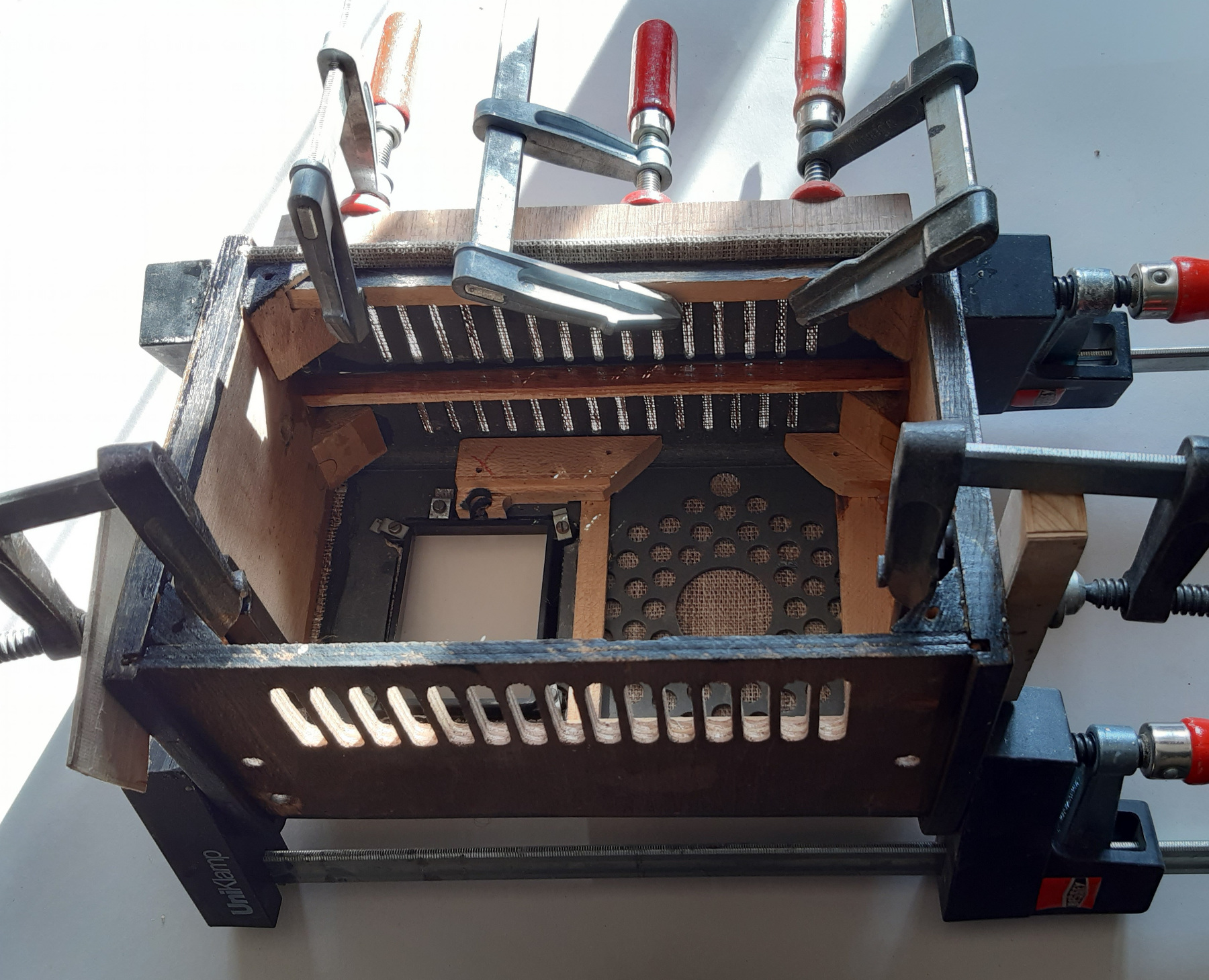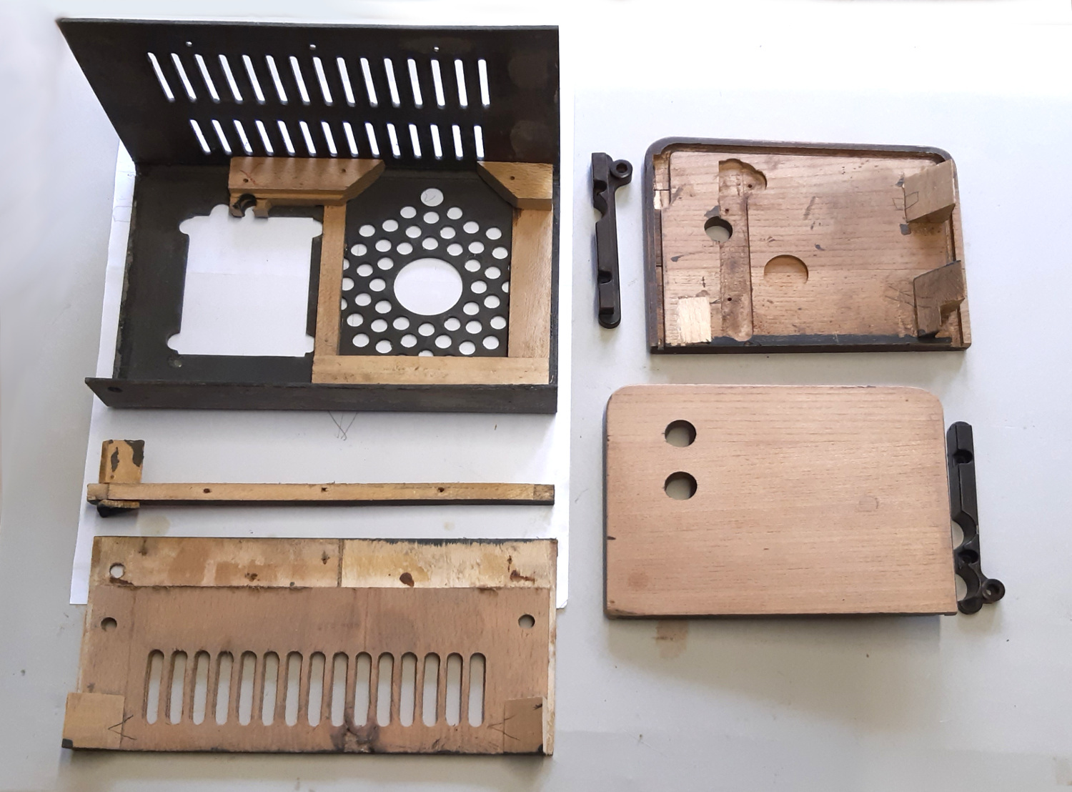 Die schlechte Nachricht zuerst: Für den Austausch der Bespannung muß das Gehäuse komplett zerlegt werden. Am Gerät sind die Spuren von erfolglosen Zerlegungsversuchen unübersehbar. Die verleimten Eckverstärkungen müssen mit vorsichtigen Schlägen auf die Innenkante der Seiten gelockert werden. Sie lösen sich an der Preßpappe. Die Nut muss restlos von alten Leimresten gesäubert werden, dann passt auch der spätere Zusammenbau, ohne das sich das Gehäuse verwindet. Die alte Bespannung ist mit Leimwasser geklebt. Die Oberfläche der Preßpasse glatt schleifen. Zum Aufbringen des neuen Gewebes beginnt man an der Oberkante und leimt die Teilflächen einzeln mit dünnflüssigem Knochenleim vor - bei den Klebungen ist Knochenleim den modernen Klebern vorzuziehen, denn er läßt sich leichter lösen.