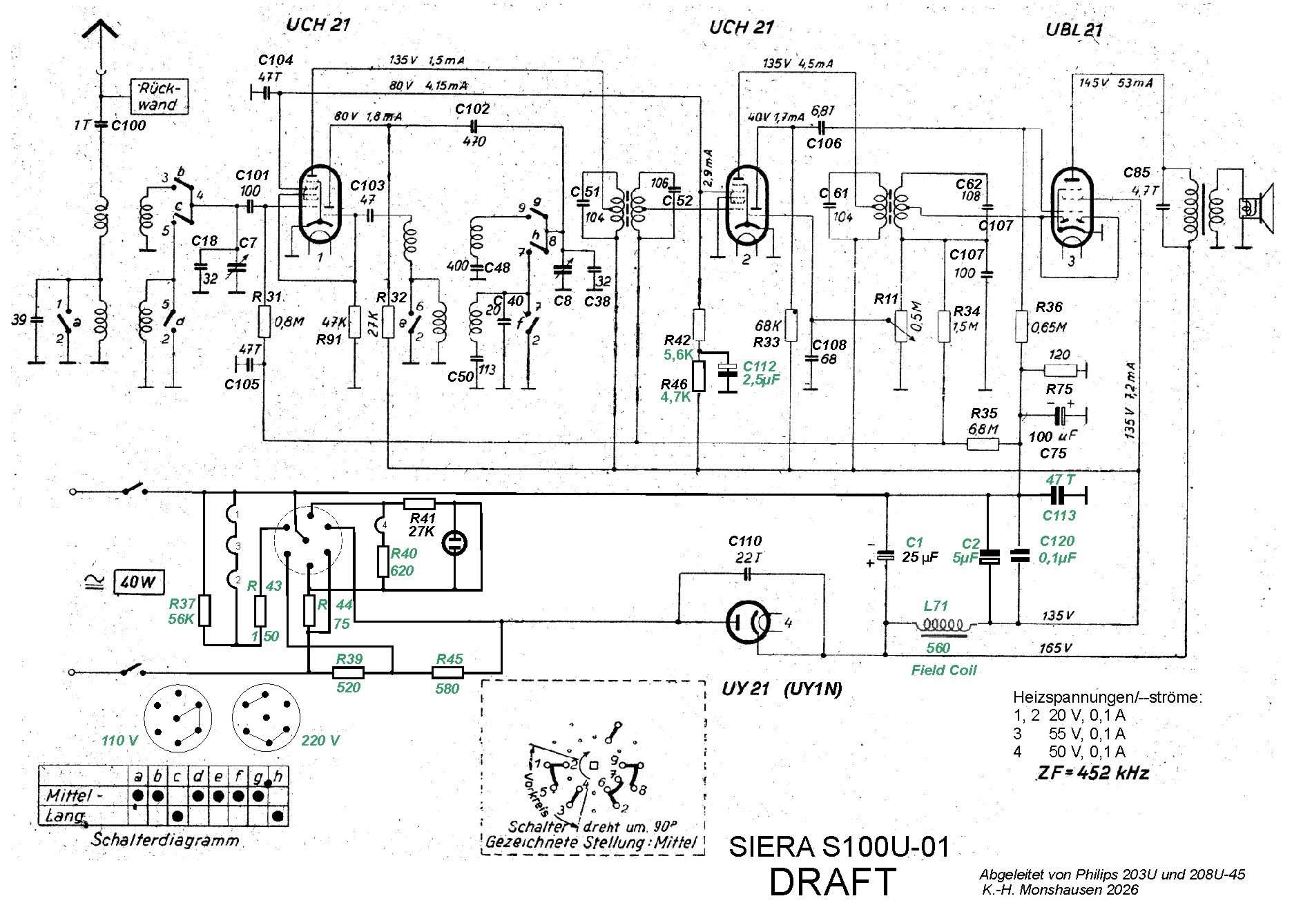 Es existieren verschiedene Schaltplanausgaben für den 203U, aber für den S100U ist kein separater Schaltplan bekannt. Ein oberflächlicher Blick auf die Chassisunterseite des S100U zeigt zwar viele Übereinstimmungen, aber auch eine Reihe von Unterschieden zwischen beiden Typen, die sich auch in einem abweichenden Schaltplan niederschlagen. Statt des C110 finden wir an seiner Stelle einen Elko 100 µF, im 203U sind 6 Rollkondensatoren auf der Unterseite verschaltet, im S100U zählen wir 8. R1 fehlt beim S100U, wird durch Feldspule in der Siebkette ersetzt. Abb. 10 zeigt den Versuch, alle die festgestellten Abweichungen in einen S100U Schaltplan zusammenzutragen, Ausgangspunkt ist der Regelien-Schaltplan zum 203U.